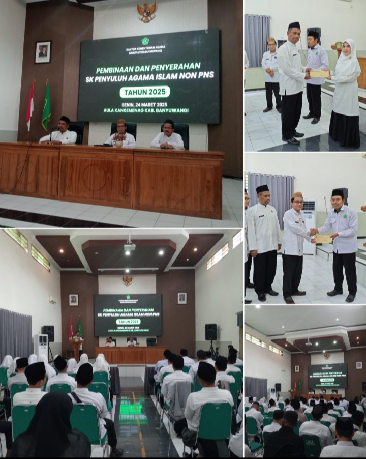 BANYUWANGI. || Pratama News.Com || 24 Maret 2025 || Kantor Kementerian Agama Kabupaten Banyuwangi menggelar kegiatan pembinaan dan penyerahan Surat Keputusan (SK) bagi Penyuluh Agama Islam Non-PNS yang telah lulus seleksi Pegawai Pemerintah dengan Perjanjian Kerja (PPPK). Acara yang berlangsung di Aula Kemenag Banyuwangi ini dihadiri oleh para penyuluh yang segera beralih status menjadi ASN PPPK.