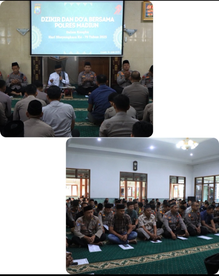 MADIUN ||PratamaNews.com || Dalam rangka memperingati Hari Bhayangkara ke-79, Polres Madiun Polda Jatim menggelar kegiatan Dzikir dan Doa Bersama di Masjid At-Taqwa pada Kamis 19/6/2025.