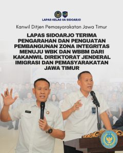 Lembaga Pemasyarakatan Kelas IIA Sidoarjo hari ini menerima kunjungan dan pengarahan langsung dari Kepala Kantor Wilayah Kementerian Imigrasi dan Pemasyarakatan Jawa Timur dalam rangka penguatan pembangunan Zona Integritas (ZI) menuju Wilayah Bebas dari Korupsi (WBK) dan Wilayah Birokrasi Bersih dan Melayani (WBBM).
