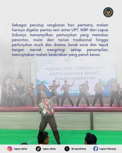 Sebagai penutup rangkaian hari pertama, malam harinya digelar pentas seni antar UPT. Dalam kesempatan ini, WBP Lapas Kelas IIA Sidoarjo membawakan drama monolog yang menyentuh hati, mengangkat kisah nyata perjalanan hidup mereka—dari saat tertangkap akibat penyalahgunaan narkoba hingga proses mereka menjalani pembinaan di dalam lapas. Penampilan tersebut berhasil menggugah emosi penonton dan menjadi refleksi akan pentingnya kesempatan kedua dalam hidup.