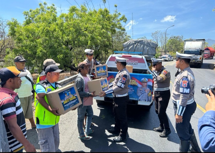 Selain berbagi sembako, Satlantas Polres Situbondo Polda Jatim juga menyampaikan imbauan tertib berlalu lintas dan pentingnya mematuhi aturan demi keselamatan bersama.