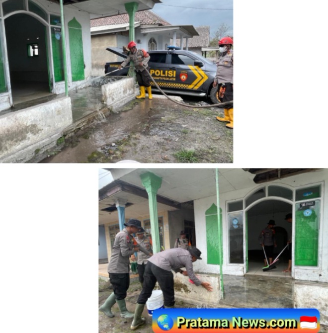Personel Polres Lumajang bersama Satbrimob dan Samapta Polda Jawa Timur melaksanakan pembersihan beberapa fasilitas ibadah dan rumah warga di wilayah terdampak.