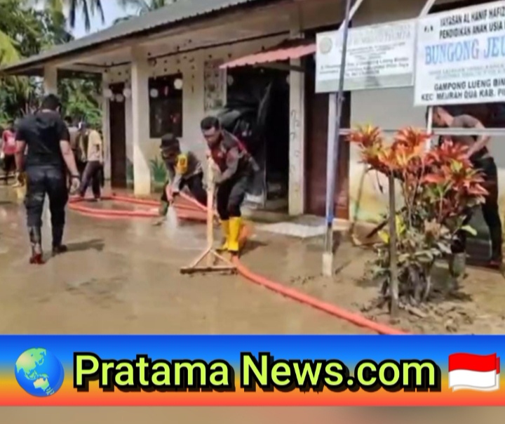 MEUREUDU || PratamaNews.com || Polres Pidie Jaya bersama masyarakat melaksanakan kegiatan gotong royong dalam rangka pemulihan pascabencana banjir di wilayah hukum Polres Pidie Jaya, Jumat 2 Januari 2026. Kegiatan ini merupakan bentuk sinergi Polri dan masyarakat guna mempercepat pemulihan fasilitas umum, lingkungan, serta sarana pendidikan yang terdampak banjir.