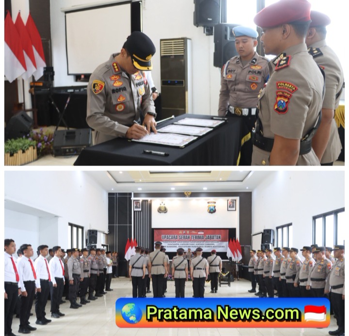 BANYUWANGI || PratamaNews.com || Kapolresta Banyuwangi Kombes Pol Dr. Rofiq Ripto Himawan, S.I.K., S.H., M.H., memimpin langsung upacara serah terima jabatan (sertijab) sejumlah Kasat dan Kapolsek jajaran Polresta Banyuwangi, Kamis pagi (20/1/2026), di Gedung Rupatama Wira Pratama Polresta Banyuwangi.