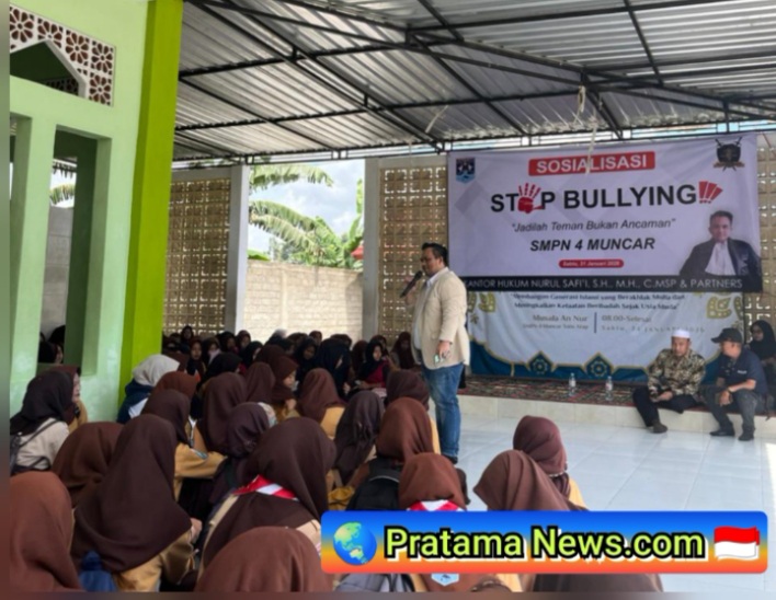 BANYUWANGI ||PratamaNews.com||  Komitmen menciptakan lingkungan pendidikan yang aman dan bebas dari perundungan (bullying) terus diperkuat. SMP Negeri 4 Muncar menyelenggarakan kegiatan Sosialisasi dan Deklarasi Anti Bullying yang diprakarsai oleh Ketua Komite SMPN 4 Muncar, Nurul Safii, S.H., M.H., yang juga berprofesi sebagai advokat, sekaligus bertindak sebagai pemateri utama, pada Sabtu, 31 Januari 2026.