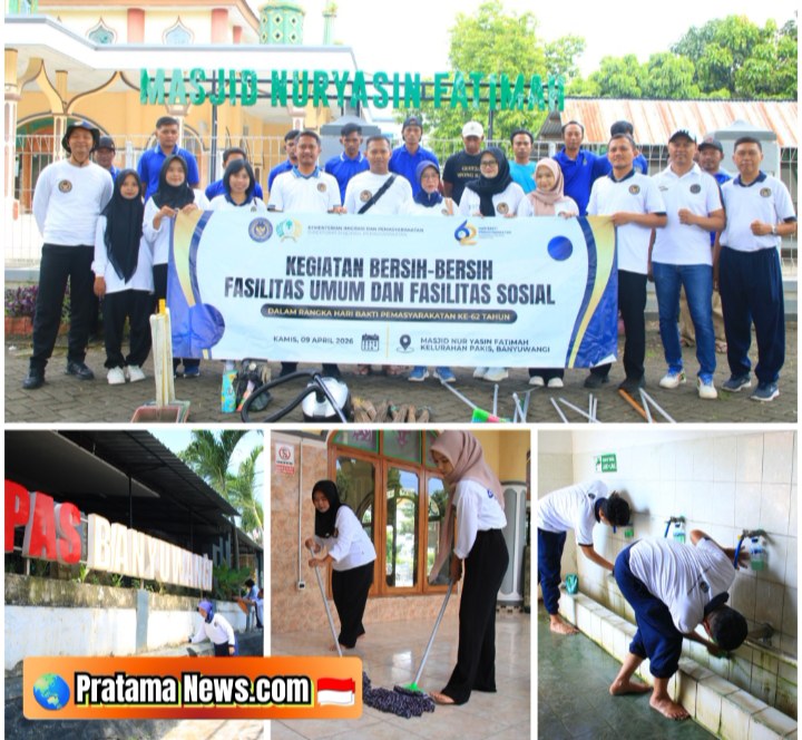 BANYUWANGI || PratamaNews.com || Menyongsong peringatan Hari Bhakti Pemasyarakatan (HBP) ke-62 tahun 2026, Lembaga Pemasyarakatan (Lapas) Kelas IIA Banyuwangi menggelar aksi bakti sosial bersih-bersih lingkungan, Kamis (9/4). Kegiatan ini melibatkan jajaran pejabat struktural, pegawai, hingga perwakilan Warga Binaan.