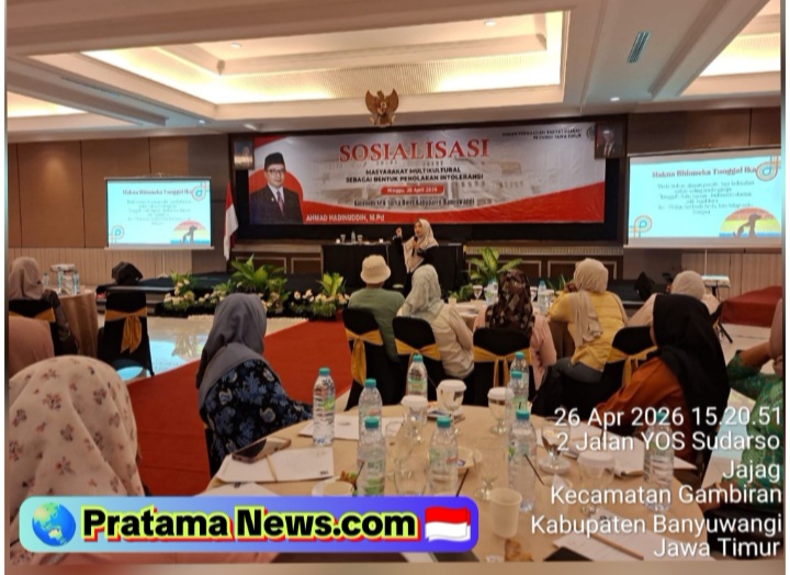 BANYUWANGI || PratamaNews.com || Anggota DPRD Jawa Timur dari Fraksi Partai Gerindra, Ahmad Hadinuddin, menegaskan bahwa intoleransi merupakan ancaman nyata yang dapat merusak harmoni sosial dan memecah belah persatuan bangsa. Pernyataan tersebut mengemuka dalam kegiatan sosialisasi masyarakat multikultural yang digelar pada 26 April 2026 di Ballroom New Surya Hotel, Jajag, Gambiran.